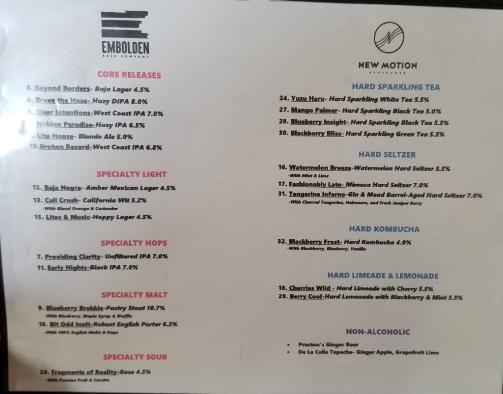 Embolden Beer Company shares its ownership and space with New Motion Beverages. Embolden brews craft beer while New Motion brews hard tea, seltzer, kombucha, and lemonade. They opened their Miramar production facility and tasting room in 2020.
